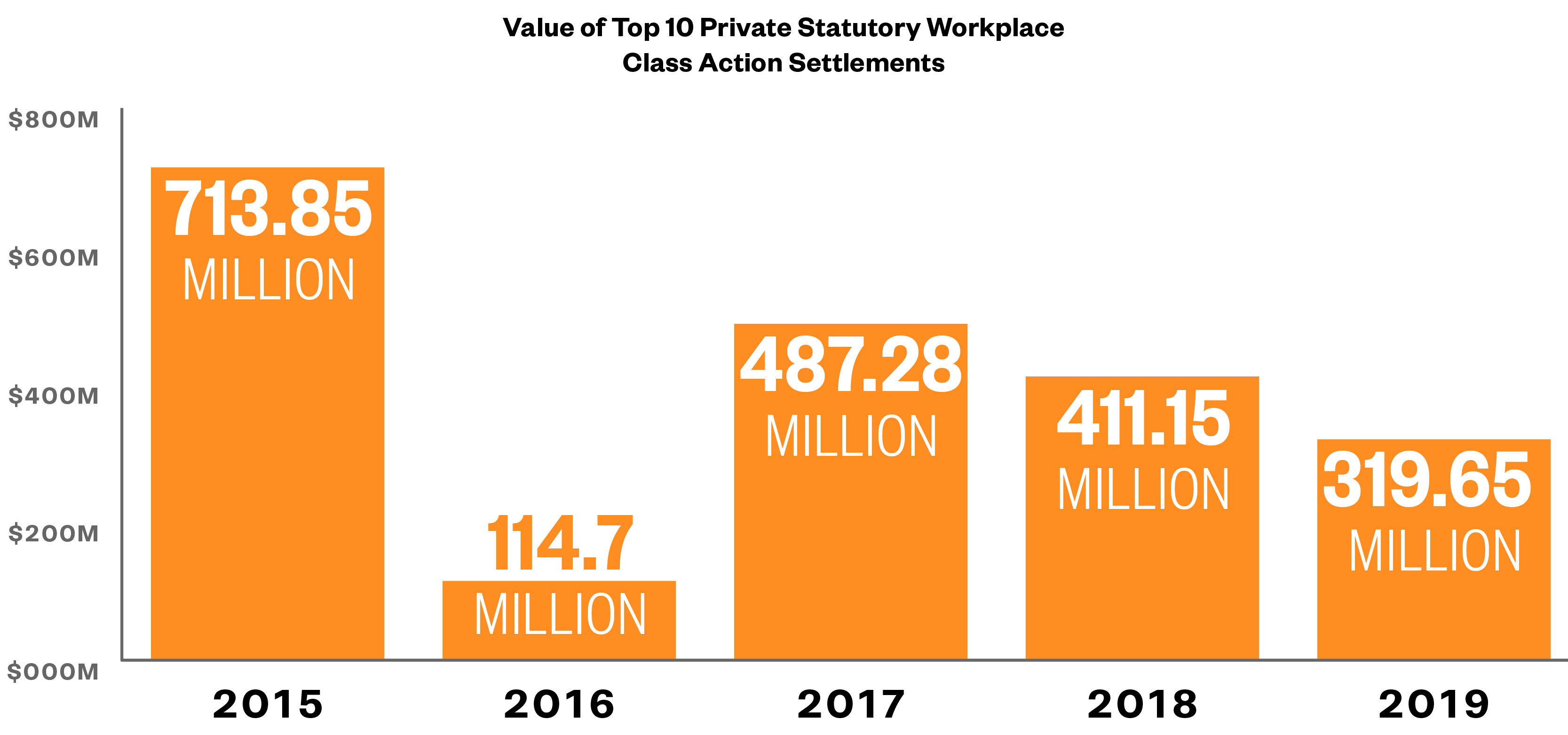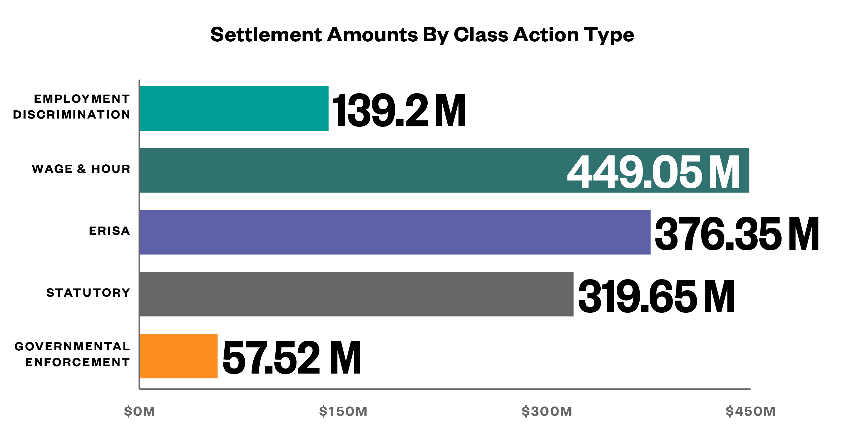 In 2019, there was a significant downward trend for the value of settlement of government enforcement litigation, employment discrimination claims, and workplace statutory class actions. In contrast, there were significant increases across-the-board for resolutions of class actions involving wage & hour class and collective actions, as well as ERISA class actions.