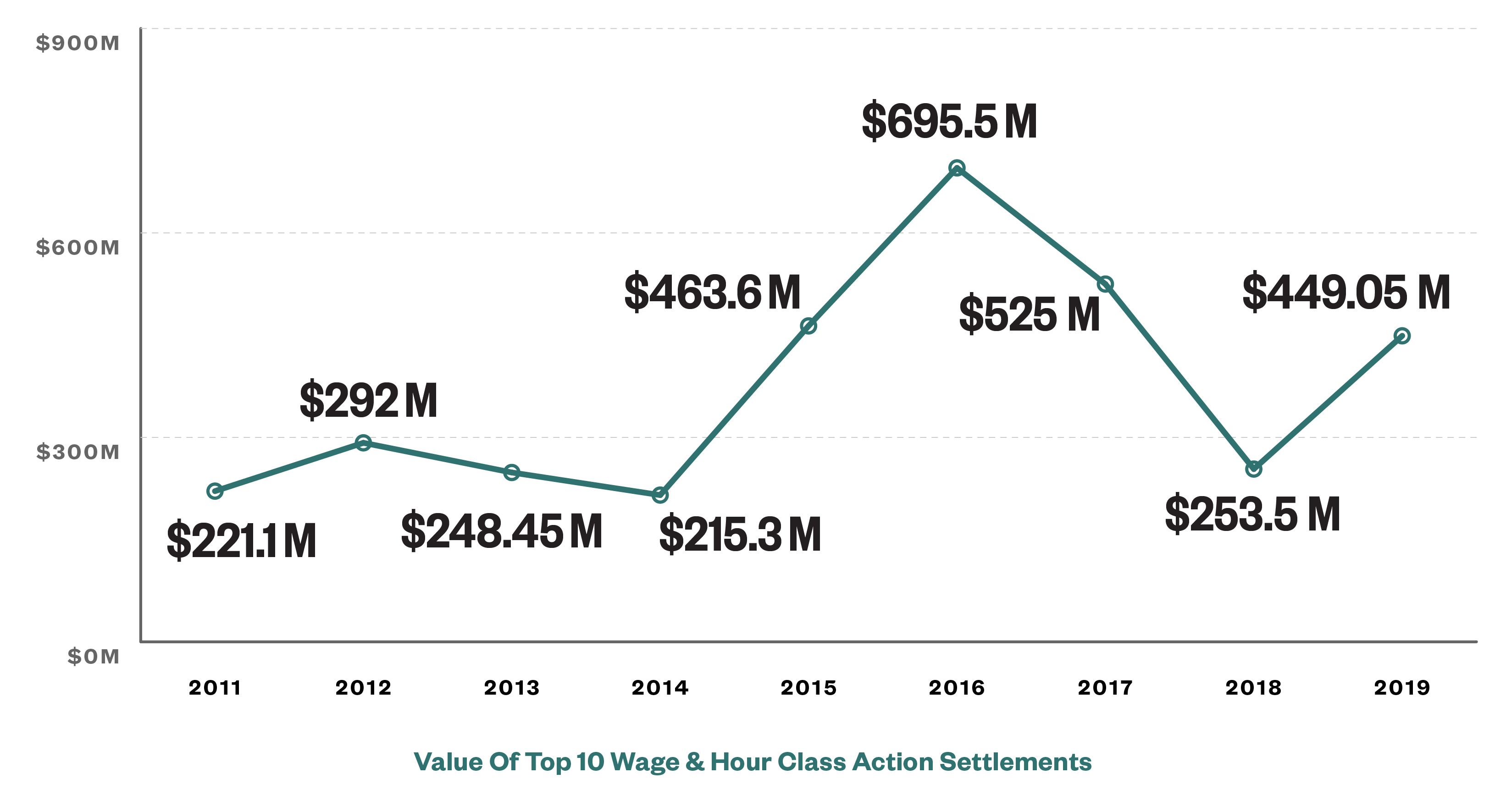 This trend did not hold for wage & hour class action settlements. The value of those settlements in 2019 nearly doubled from the previous year. In 2019, the value of the top ten wage & hour settlements was $449.05 million as compared to $253.18 million in 2018. This was a slight decrease from 2017, when the value of the top ten settlements spiked at $574.49 million, which was the second highest annual total in wage & hour class actions ever.